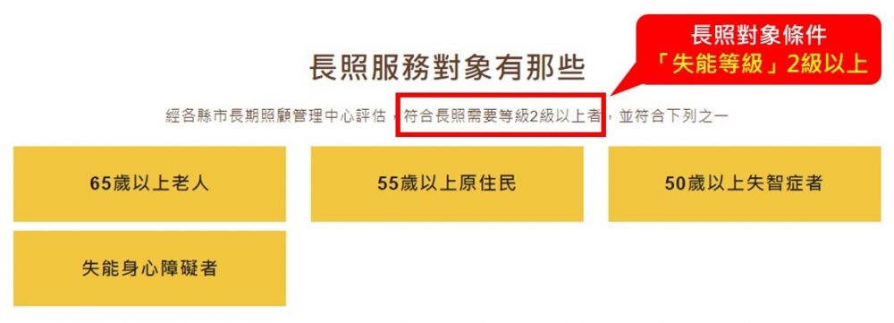 一、長照對象並非都以年齡界定。對於年長族群,也必須同時滿足年齡及「失能等級」2級以上的條件;年齡劃定也並非都是65歲,55歲以上原住民、50歲以上失智患者都能申請。對於失能的身心障礙者,申請並無年齡限制。